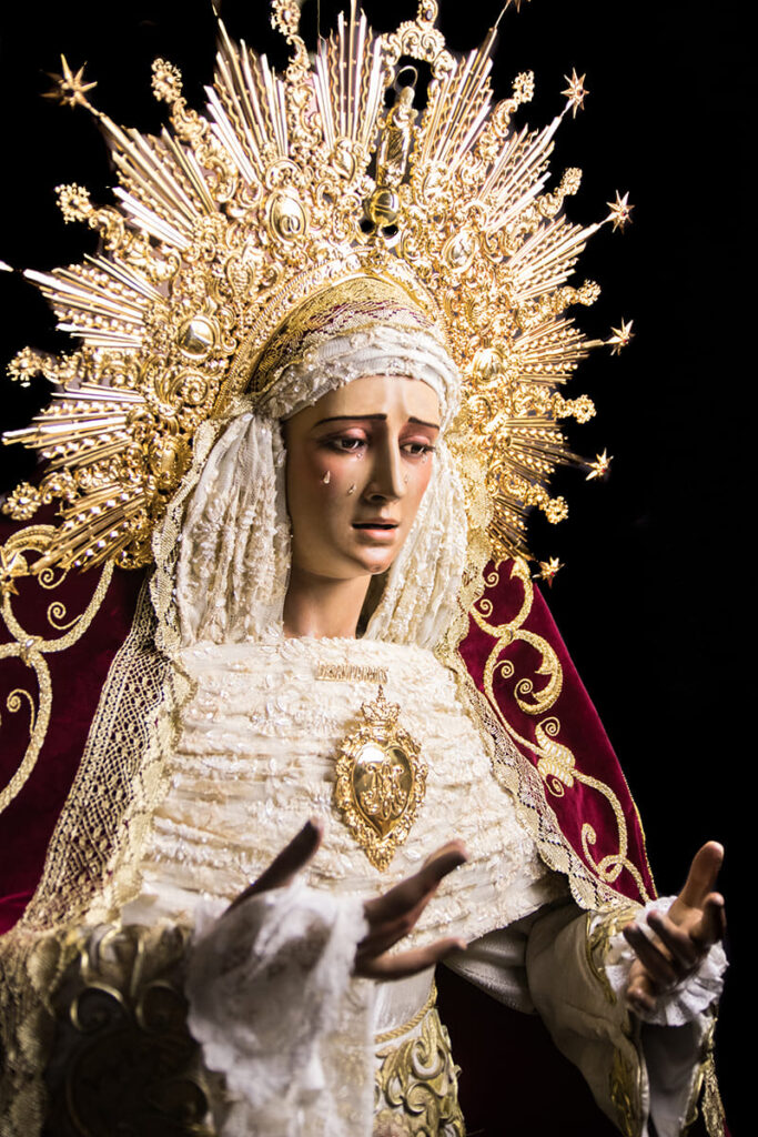 La imagen de Nuestra Señora de los Desamparados realiza su salida procesional cada mes de mayo, al pie de la Santa Cruz. Y es que, a pesar de las lágrimas que brotan de sus ojos, María, primer Sagrario, Madre de Cristo, erguida ante la Cruz es fiel testigo de la Gloria del Señor asumiendo la voluntad de Dios.
