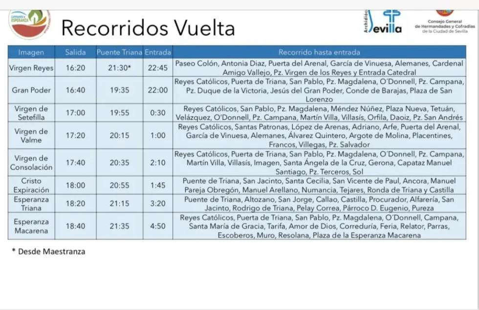 Las imágenes marianas procedentes del resto de la provincia tendrán tres puntos de referencia después de la procesión. La Virgen de Consolación llegará a la iglesia de los Terceros, sede de la Hermandad de la Sagrada Cena; la Virgen de Valme lo hará, en su tercer caminar por las calles de Sevilla, a la iglesia colegial del Divino Salvador, y el paso con la devoción loreña, Nuestra Señora de Setefilla, regresará tras la procesión a iglesia parroquial de San Andrés