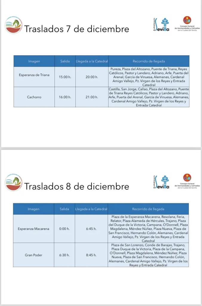 Lógicamente, los traslados de los pasos a los lugares desde los que participarán en la procesión dilatará el seguimiento de los fieles y devotos varias horas antes del inicio previsto. La Esperanza de Triana será la primera hermandad en poner a su titular en la calle, el 7 de diciembre a las tres de la tarde. Una hora después saldrá el Cachorro de su basílica, y ya metidos en el día 8 lo harán la Macarena (a las doce de la noche) y el Gran Poder (a las seis y media de la mañana, llegando a la Catedral a las nueve menos cuarto).