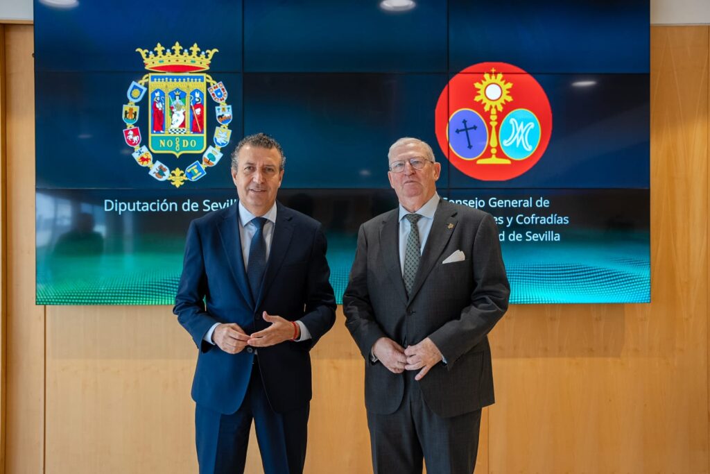 Los presidentes de la Diputación de Sevilla y del Consejo General de Hermandades y Cofradías de Sevilla, Javier Fernández y Francisco Vélez de Luna, respectivamente, han firmado este viernes en la Sede de la Puerta de la Carne el protocolo de patrocinio de la Institución provincial a la Procesión Magna de clausura del II Congreso