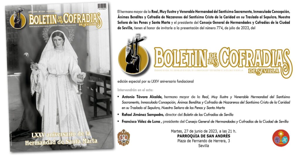 PRESENTACIÓN DEL BOLETÍN DE LAS COFRADIAS DEL MES DE JULIO.Por Redaccion / 27 de junio de 2023 Cuándo 27 de junio de 2023 Todo el día Añadir al calendario Descargar ICS Google Calendar iCalendar Office 365 Outlook Live Tipo de evento Boletin PRESENTACIÓN DEL BOLETÍN DE LAS COFRADIAS DEL MES DE JULIO. HDAD. DE SANTA MARTA Martes, 27 de junio⋅21:00