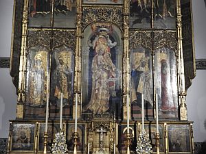 El retablo constituye una de las más importantes obras del pintor alemán avecindado en Sevilla, Alejo Fernández, que lo realizó hacia 1520. Consta de sotobanco, banco, dos cuerpos y cinco calles, respondiendo por su estructura al gótico tardío, aunque sus pinturas muestran ya las novedades del Renacimiento italiano. En el banco figuran seis tablas que representan tres obispos, un Ecce Homo y una imagen de la Virgen con el Niño de estilo bizantino, probablemente traída de Italia por el fundador.